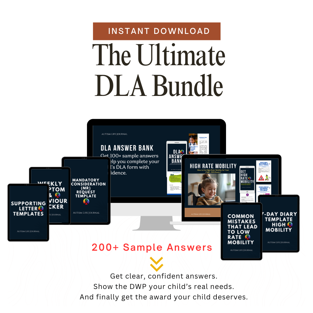 Created by a parent who’s been through the process and researched exactly how the DWP assesses claims, this two-part Answer Bank Bundle breaks down the DLA and High Rate Mobility sections in plain English — with ready-to-adapt examples, evidence tips, and templates that show you how to get your child’s needs understood the first time.